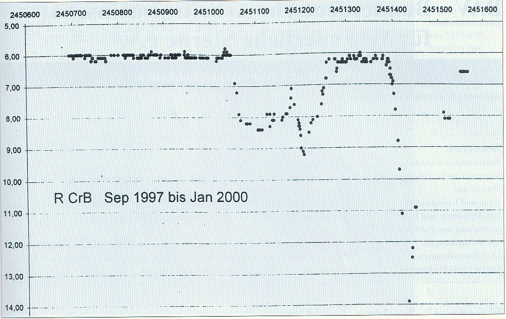 Wer dachte, die Eruptiven Sterne bieten nur Helligkeitsexplosionen, kann mit den R-CrB-Sternen das Gegenteil beobachten. Bei diesen Veränderlichen sinkt die Helligkeit rapide in unregelmäßigen Abständen. Grund dafür sind riesige Rußwolken, die ein Roter Riese auswirft, wenn er an seiner Oberfläche viel Kohlenstoff zeigt. Diese Wolken können in kurzer Zeit den Stern bedecken und zu einem erheblichen Helligkeitseinbruch führen. Der Namensgeber R Coronae Borealis bietet normalerweise eine Helligkeit um 6 mag (von minimalen Schwankungen abgesehen), kann aber bei einer Verrußung bis auf 15 mag abfallen. Die Lichtkurve ist unregelmäßig eingeschnitten, manchmal mehrmals hintereinander, dann wieder für lange Zeit im Maximallicht. Der Stern läßt sich gut mit einem Feldstecher überwachen, der Abstieg kann mit dieser Optik auch anfänglich weiterverfolgt werden.