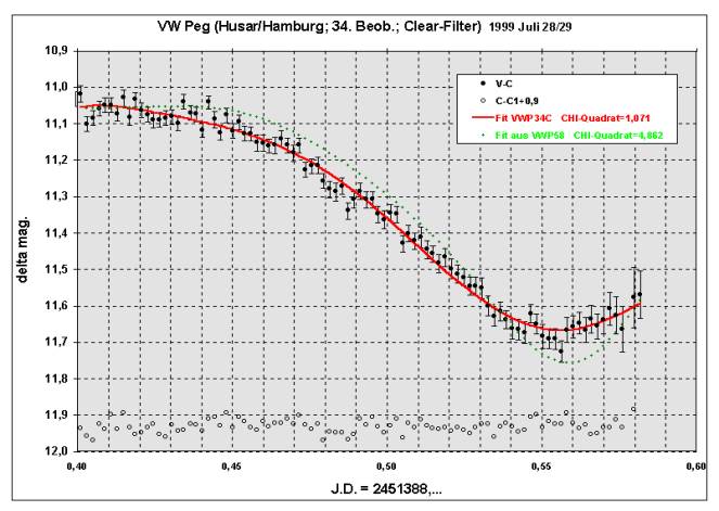 Die kürzlich erschienene Veröffentlichung über VW Pegasi im IBVS 4916 [1] wird als BAV Mitteilung Nr. 129 zusammen mit dem BAV Rundbrief 4/2000 verteilt. Wie schon im Vortrag soll im Folgenden insbesondere über die spezielle Auswertemethodik berichtet werden, welche nicht ohne weiteres aus der Veröffentlichung zu ersehen ist. Im Verlauf dieses Artikels wird mehrfach auf die Abbildungen und Tabellen der IBVS-Veröffentlichung verwiesen. Anders als im Vortrag müssen an dieser Stelle aus Platzgründen alle Ausführungen über Hilfsmittel zur Beobachtungsplanung, zur Leistungsfähigkeit der heutigen CCD-Technologie und über CCD-Beobachtungstechniken bei widrigen Beobachtungsbedingungen, sowie über das Vorgehen bei Literaturrecherchen im Internet entfallen.