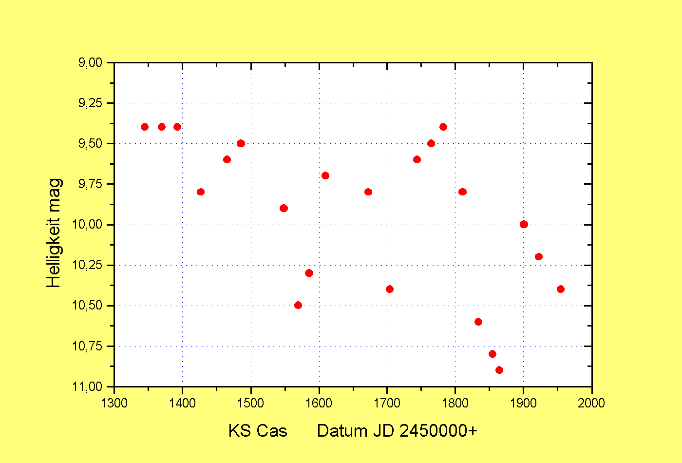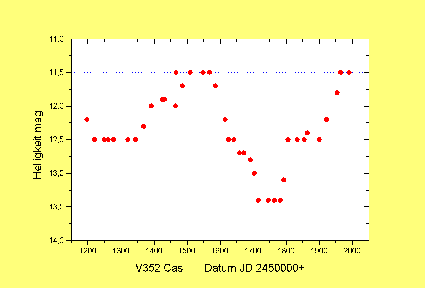 Es zeigt sich ein Lichtwechsel mit fast 2 mag Amplitude und einer Welle im Anstieg. Die erste Schätzung darf nicht überbewertet werden. Oft findet sich in meinen Kurven der Fall, dass die erste Schätzung im Vergleich zu den nachfolgenden Schätzungen deutlich zu hell oder zu schwach ist. Warum kann ich nicht sagen!
