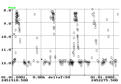 Dank einer verbesserten Zusammenarbeit mit der AFOEV konnte im vergangenen Jahr 2001 die Sammlung aller Beobachtungen durch BAV Mitglieder optimiert werden. Ich muß die ausgefüllten Beobachtungsbögen nun nicht mehr durchgehen, die eruptiven Sterne heraussuchen und die Beobachtungen in die Datenbank eintragen. Herr Schweitzer schickt per EMail etwa zwei bis drei Wochen nach Monatsende die von der AFOEV abgetippten Daten per EMail in einem leicht lesbaren Textformat, so daß die Daten nach einem kurzen Abgleich mit den Kopien der Beobachtungsbögen in die Datenbank integriert werden können. Doppelte Eintragungen, z.B. durch das Auftauchen der Bebachtungen in monatlichen oder täglichen EMails sowie im File der AFOEV, fängt das Datenbankprogramm ab. Problematisch bleiben Ungenauigkeiten bei den Zeitangaben, die in manchen EMails bis zu vierstellig sind, aber in der AFOEV-Datei teilweise nur noch eine Stelle aufweisen. Alle Beobachter, insbesondere die EMailer, mögen bitte in ihren verschiedenen Reports (an mich persönlich, an das VSNET und die AFOEV) immer die gleiche Genauigkeit verwenden.