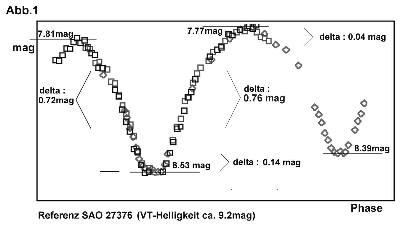 Nun war das Interesse geweckt ! Weitere Lichtkurven folgten, sowohl für die beiden Minima als auch für die Maxima. Siehe Tabelle im Anhang. Das zusammengefaßte Ergebnis ist folgendes (Abb.1):