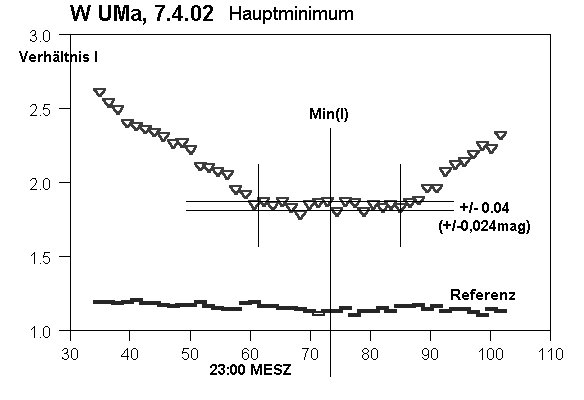 Die erste Minimumbestimmung war eine Überraschung: daß das Minimum ca.10 min früher als vorausgesagt kam,war noch vertretbar,daß aber der Minimumsverlauf einen Bereich konstanter Helligkeit von immerhin 20 min besaß, kam unerwartet. W UMa-Lichtkurven sollten eigentlich in jeder Phase kontinuierlich verlaufen.Ausnahme: Unterklasse 'W'[2].Dieser Sachverhalt wird erst bei entsprechender Darstellung der Zeitachse sichtbar.