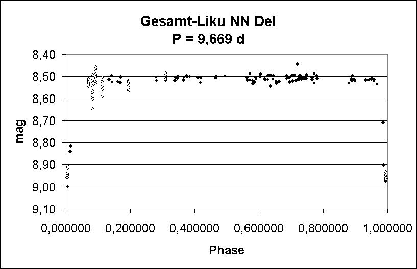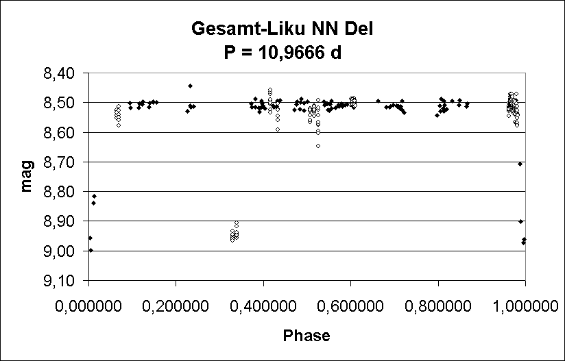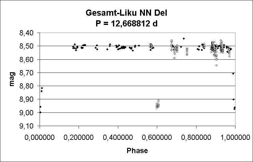 Nun galt es, dieses Ergebnis durch weitere Beobachtungen zu verifizieren. Sehnsüchtig wartete ich auf die nächste klare Nacht. Optimal wäre die Nacht vom 10. zum 11. Oktober, da mein MinMax- Rechner für den 11.10. um 0:02 MEZ ein weiteres Minimum für NN Del vorhersagte. Doch zunächst konnte ich am 6. Oktober einige Beobachtungen im Maximum machen, die sich gut in die Lichtkurve einfügten. Am 10. klarte es bereits am Nachmittag auf und blieb auch die Nacht so. Diesmal verarbeite ich die Photometriedaten sofort weiter, aber der Helligkeitswert blieb Stunde um Stunde im Bereich 8m5 stehen, nicht der kleinste Helligkeitsabfall. Um mögliche Fehler in der Berechnung abzufangen, beobachtete ich auch die Nacht vom 11. auf den 12. Oktober. Auch hier zeigte sich der Stern wieder im Maximallicht. Pech gehabt, kein Minimum. Die vermutete Periode stimmte demnach nicht.