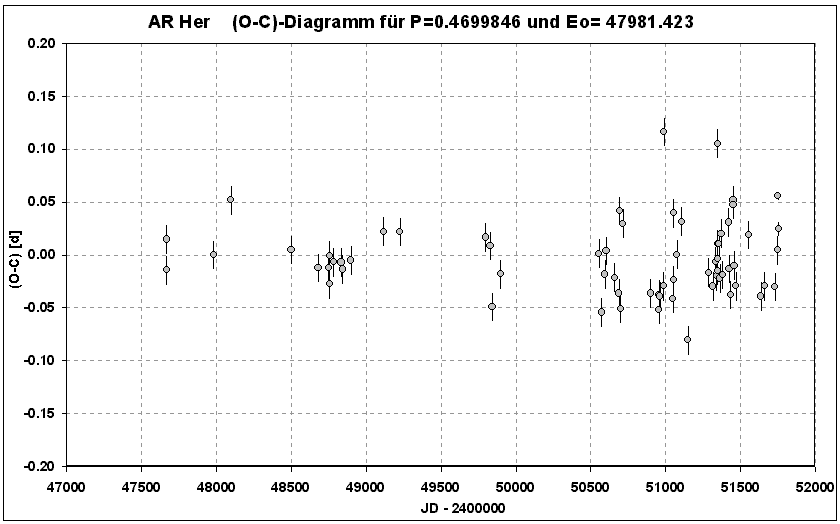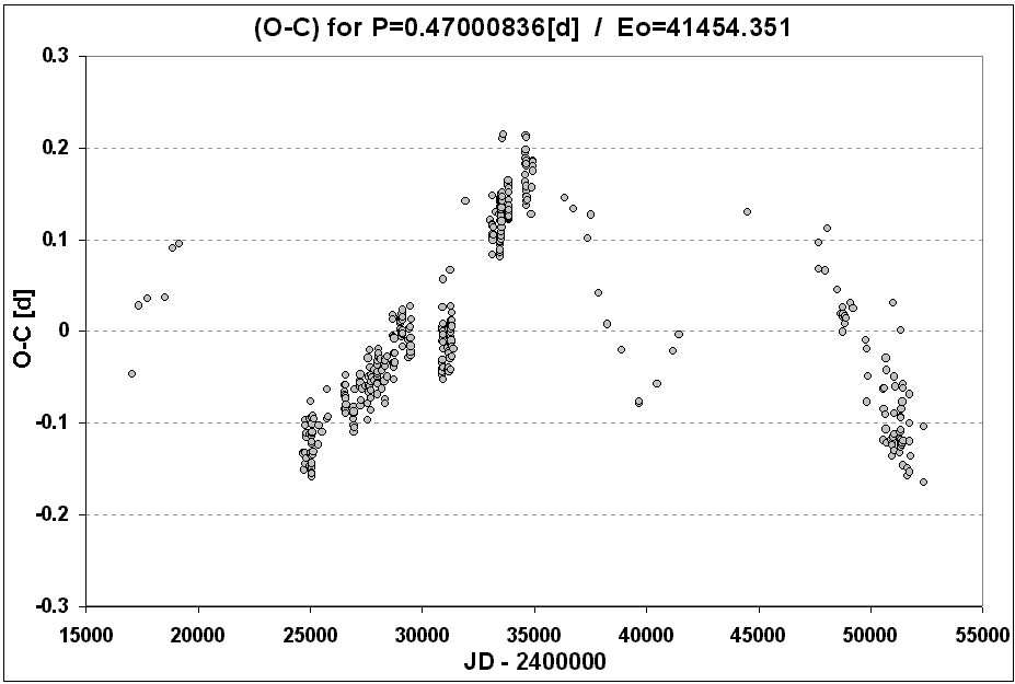 Wie man sieht: ein "Auf und Ab" in den instantanen Perioden. Dies wird bei der Wahl einer "mittleren" Periode von P=0.47000836 [d] in einem (O-C)-Diagramm gut dargestellt (siehe Abb. 7).