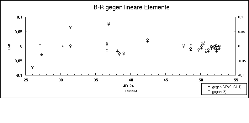 Schon wenn man nur geringfügig in die Vergangenheit geht, geben sie sehr große B-R. Legt man E0 auf das zweite Hoffmeistersche Minimum (JD 2427060,329) und berechnet aus allen Beobachtungen neue Lichtwechselelemente so ergeben sich mit den Fehlern der letzten Stelle in Klammern