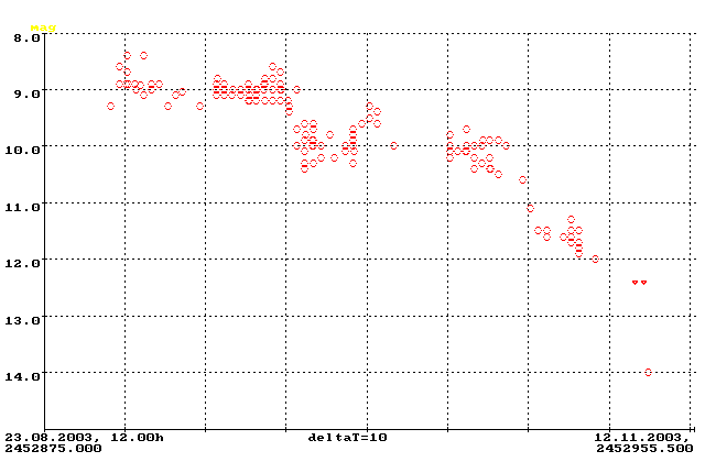 Durch die günstige Lage am Abendhimmel konnten mehrere BAV Mitglieder den Stern verfolgen, bis er Anfang November dramatisch an Helligkeit verlor und für die meisten Beobachter nicht mehr sichtbar war (Abbildung 1).