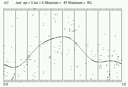 Nehmen wir also eine bestimmte Frequenz =n 1/Periode an, falten unsere Messreihe mit dieser und legen eine Sinuskurve durch. Dabei haben wir zwei freie Parameter, die Amplitude und die Anfangsphase des Sinus. Oder praktischer: Amplituden für Sinus und Cosinus, aus denen wir dann Gesamtamplitude und Anfangsphase berechnen.
