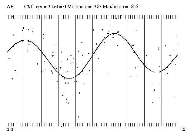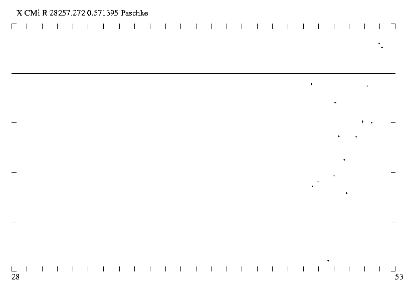 Heute sind mir 17 Maxima bekannt, siehe Abbildung 1. Nebst GCVS Basismaximum sind noch die Herren Schmidt, Layden und Birkner (BAV) mit je einem Maximum beteiligt. Meine Beobachtungen sind alle in BAV Mitteilungen veröffentlicht, hier möchte ich nur zwei Maxima angeben: 51455.899 aus Rotse- und 52145.588 aus Asas-Daten abgeleitet. Die Abbildung 1, in der eines meiner Maxima weggelassen ist, wurde mit den Elementen 28257.272 + 0.571395 gezeichnet. Man sieht aber, dass die Punkte von links nach rechts ansteigen, die Periode gegenwärtig also etwas länger ist. Vielleicht ist X CMi einer jener RR-Lyrae-Sterne, die ihre Periode immer verlängern, so wie RR Leo. Sicher ist das aber nicht, wir brauchen weiterhin etwa eine Beobachtung im Jahr. Das Asas-Projekt läuft ja weiter und zwei oder drei Jahre Asas-Beobachtung ergeben genug Messpunkte für eine genügend genaue Bestimmung des Maximums. Also reicht es, wenn wir, ich oder andere BAV-Beobachter, alle zwei Jahre ein Maximum beobachten.