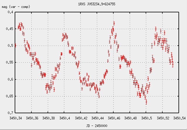 Dieser kataklysmische Stern im Sternbild Camelopardalis (Giraffe) wurde vor einiger Zeit vom BAV-Mitglied Klaus Bernhard, Linz, entdeckt. Die Koordinaten lauten 05h32m33.87s +62°47'52.1'' (JD 2000.0). Bei Helligkeitsmeldungen sollte bitte die Designation 0523+62 und der Name RXJ053234 verwendet werden.
